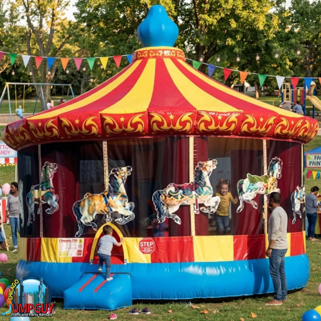 The Carousel Bounce House is the premium standard unit for Elmhurst birthday parties across 60126. The distinctive carousel design drives immediate crowd recognition at backyard events near Wilder Park and along the Salt Creek corridor. Full perimeter netting, commercial bounce chamber, and a decorative profile that elevates any residential event. Fits through standard gates throughout the York Road and Spring Road neighborhoods. Same-day confirmation through jumpguy.com.