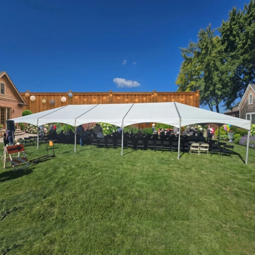 The high peak frame tent is the go-to outdoor coverage solution for Elmhurst backyard events and park district setups in 60126. Sets up on grass or pavement without center poles; clear interior span works for parties of 20 to 100 guests. Available with optional side walls for full weather protection.
