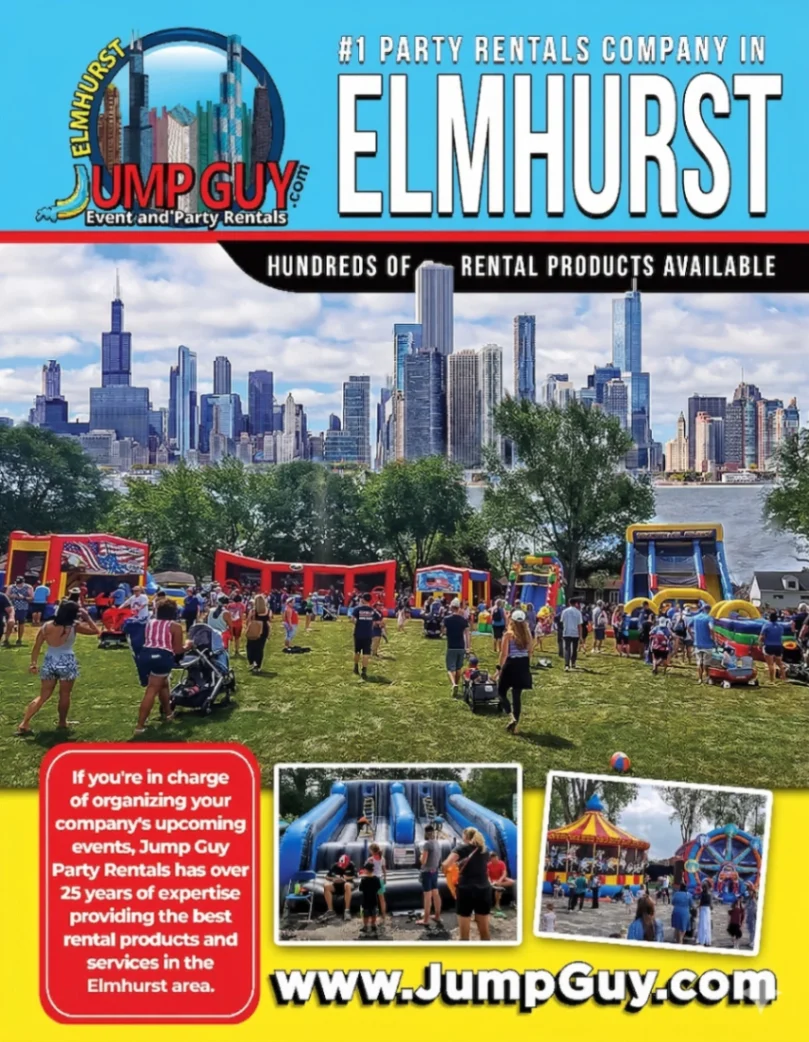 Elmhurst party rentals is the Elmhurst node in the Jump Guy service network, positioned at the inner edge of DuPage County, 20 miles from downtown Chicago, and serving the full zip code 60126 corridor. Standard delivery zones include Villa Park, Lombard, Oak Brook, Addison, and Wheaton. Same-day confirmation on most orders. The same 30-year Jump Guy operation, the same 150-plus unit fleet, delivered to the community that sits between Chicago and the western suburbs.